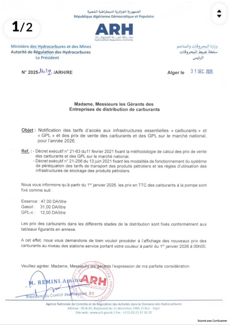 Dans une correspondance officielle adressée aux exploitants des établissements de distribution de carburant, l’ARH, relevant du ministère des Hydrocarbures et des Mines, a annoncé les nouveaux prix de vente des carburants et du gaz de pétrole liquéfié sur le marché national algérien, applicables à compter du 1er janvier 2026. Elle a exigé de l’ensemble des stations-service l’affichage clair des nouveaux tarifs dans leurs installations, assorti d’un engagement à les appliquer strictement et immédiatement à la date fixée.
