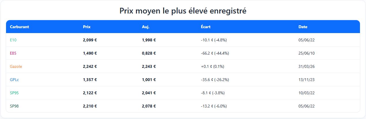 Un prix moyen national à 2,242 €/l correspond à un coût d’environ 112,10 € pour un plein de 50 litres. À 2,243 €/l, on monte encore légèrement. Le choc est encore plus visible lorsqu’on compare ce niveau au prix moyen le plus bas historiquement enregistré pour le gazole, soit 0,879 €/l le 13/04/2009. L’écart atteint désormais 136,4 centimes par litre, soit une hausse de 155,2 %.