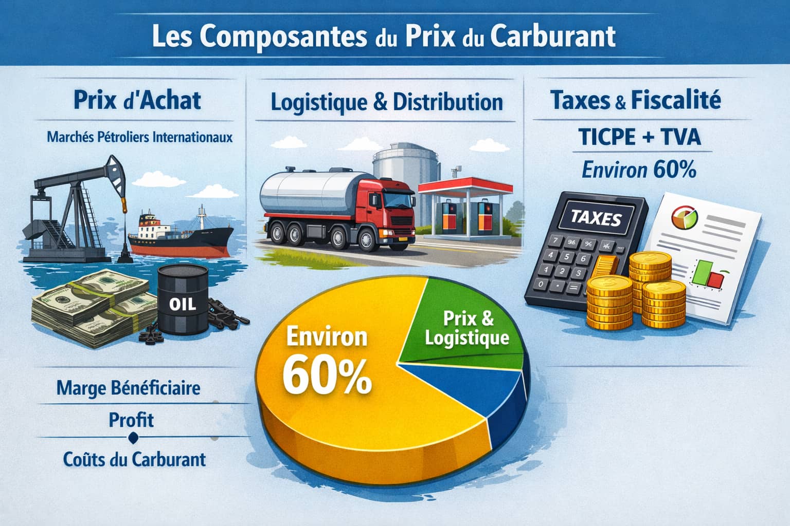 - la fiscalité (TICPE + TVA), représentant environ 60 % du prix final